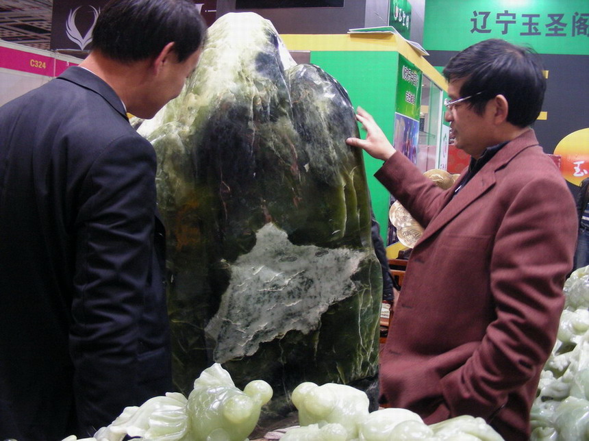 圖為商興成市場投資管理(義烏)有限公司總經(jīng)理、浙江商成專業(yè)市場研究所執(zhí)行所長許慶軍先生與參展商遼寧玉圣閣珠寶玉器有限公司董事長文成先生交談。
